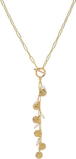 Make your next outfit sparkle with the Textured Coin & Pearl Drop Lariat Necklace by Adina Eden, a unique Necklace that stands out. Featuring fluid lines and modern sparkle, this women's lariat necklace is styled in Gold. When comfort meets confidence, this piece turns even your simplest outfit into a styled ensemble. Complement this gold plated lariat necklace with selections from the Choker Necklaces collection to build a signature look you'll love. Even your simplest looks feel curated when you add this piece.