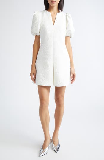 Puffed sleeves sweetly frame this structured fit-and-flare minidress made from a touchable textured fabric that elevates the whole look.
