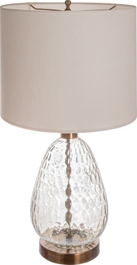 - This elegantly versatile table lamp showcases a hammered glass and antique bronze metal base topped with a white cotton drum shade