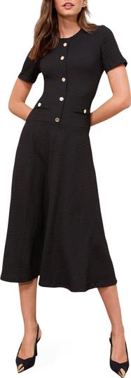 Slip into sophistication in this textured jersey midi dress styled with a drop-waist design and polished goldtone buttons. Short sleeves and a softly swaying skirt make it a versatile option for day or evening.
