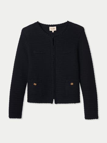 Luxurious cashmere cardigan featuring a textured knit body, elegant braided trim, and refined gold-button pockets. Perfect for layering, this timeless piece blends warmth, softness, and sophistication, making it an essential choice for special occasions.