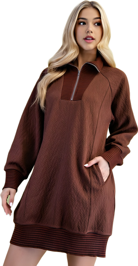 Slip into effortless cool with this rich chocolate brown half-zip dress by Knit & Lounge, designed with cozy textured knit fabric and ribbed trim accents. The relaxed silhouette features long raglan sleeves, a stand collar, and side pockets for laid-back function. With a sporty yet polished edge, this elevated knit dress moves easily from casual mornings to cozy evenings—all while keeping you wrapped in comfort.