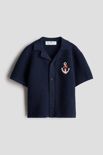 Short-sleeved shirt in textured-knit cotton with an embroidered motif. Ribbed resort collar, buttons down the front, dropped shoulders and narrow, ribbed trims at the cuffs and hem.