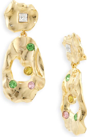 Princess-cut European crystal studs are bezel set into the organically shaped clip-on bases, while colorful embedded crystals sparkle from the molten-look drops of these earrings that make a statement of elegant contrast.