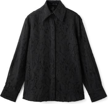 Elevate your night-out ensembles with this textured, oversized button-up shirt in a semisheer floral design that's sure to turn heads.