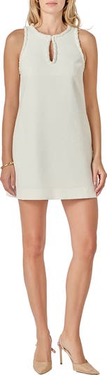 A sophisticated textured dress is cut in a leg-baring length and accented with feathery fringe trim.