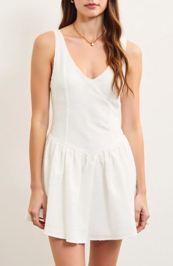 This sleeveless mini dress is crafted in a soft, textured fabric that drapes beautifully with every movement. The deep V-neckline and subtly tailored bodice enhance the silhouette, while the drop waist flows into a gently gathered skirt for an effortless feminine finish. Ideal for warm-weather occasions, this piece pairs seamlessly with heels for a polished look or sandals for casual outings. Whether you're heading to brunch or a summer event, this dress offers timeless charm with a playful twist.