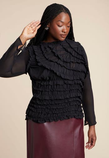 Slip into texture with this sculpturally smocked top that contours comfortably to the body. A mock neckline and sheer long sleeves create soft sophistication for day or night.