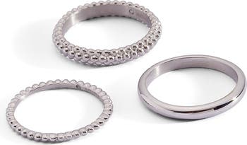 This set of three stacking rings makes layering a breeze. The first ring features a delicate ball-textured band, the next is a smooth rounded band, and the third is a domed ball-textured ring. Perfectly paired, this set takes the guesswork out of mixing and matching for a trendy, effortless look.