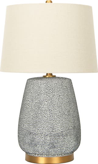 - This statement making table lamp showcases a textured stoneware base with gold accents topped with a linen shade