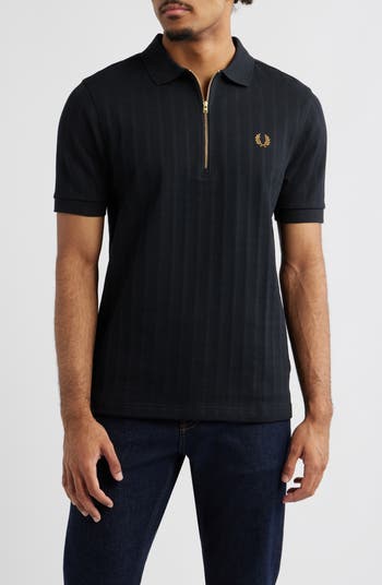 Broad, textured stripes bring dimensional detailing to a polo knit from soft cotton and designed with a short zippered placket cinching its sporty construction.