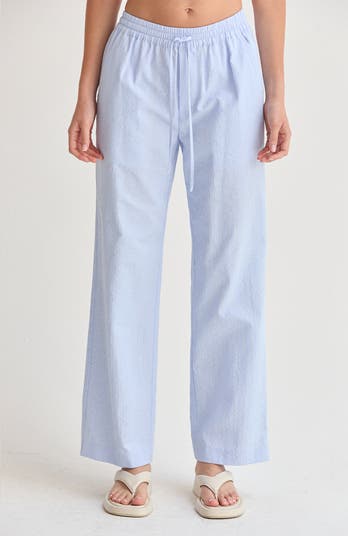 Textured striped pants designed with a relaxed straight-leg silhouette and a mid-rise elastic waistband with adjustable drawstring. Finished with side and back patch pockets, the look is easy, lightweight, and quietly polished.