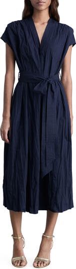 Crinkled texturing gives a lived-in look to this cotton-blend dress that's hugged by a tonal tie belt.