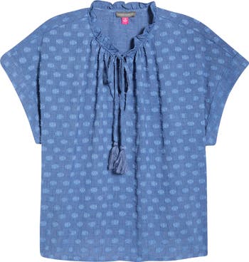 Tonal texture and frilly edges define a lightweight top tied sweetly at the split neck.