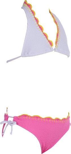 This striking bikini features a pristine white triangle top and vibrant fuchsia bottoms, both crafted from a premium honeycomb-textured fabric. The design is beautifully defined by intricate neon yellow and pink scalloped embroidery along the edges, paired with adjustable white side ties for a high-fashion, boutique-ready finish.