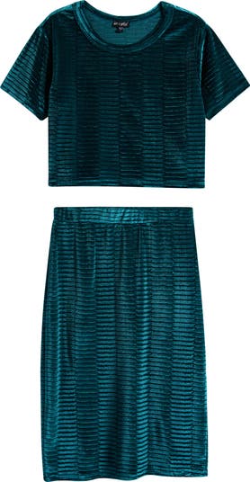 Ribbony texture punctuates the pretty velvet texture of this short-sleeve skirt set that's perfect for party season.
