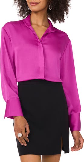 Add a vibrant pop of color with a textured satin shirt that moves from desk to dinner with elegant ease.