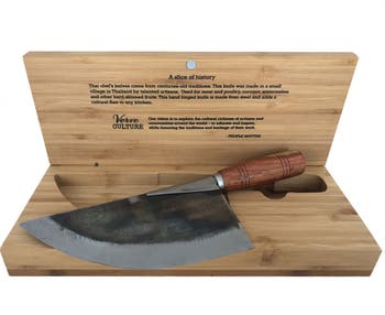 200 years of making knives has been passed down through the generations so that today, we have the fruits of this tradition through our Thai Moon Knife. Each of our Thai Moon Knives is made of carbon steel, cut and sharpened to traditional standards. This chef's knife was traditionally used for cutting pork in the markets; it even cuts through bone. It’s a dream for cutting through meat and bone, as well as hard-skinned fruit (like watermelon). The lightweight, carbon steel Moon Knife (named for its round shape) allows for a longer cut. Its light, thin blade makes it ideal for preparing coconut, watermelon, hard-skinned fruits - and, all meat. Packaged in a giftable mango wood storage box. About 200 years ago, blacksmiths made beautiful, intricate swords for the Thai-Burma war. They passed down their craft in making chefs knives. Today, a whole community is involved in a different part of the steel forging process! Families form co-operatives and have skilled workers dedicated to forging, grinding, stamping, woodwork, and finishing.