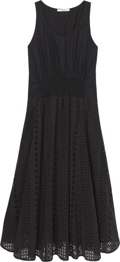 A mirthful mix of eyelet stitchery animates the swingy skirt of this trapeze dress made from soft cotton.