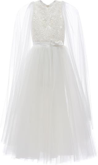 With ethereal charm and delicate artistry, the Thalia Dress makes a romantic statement. The lace-embellished bodice contrasts elegantly with the airy tulle skirt and sheer capelet for a captivating, timeless look. Designed for special occasions, it evokes grace and whimsy in every detail.