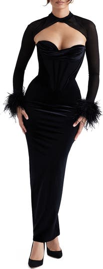 Sleek and sultry, this figure-accentuating corset dress pairs perfectly with a semisheer shrug finished with fabulous feather cuffs.