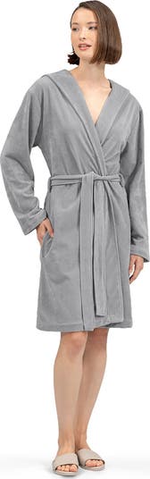 Lightweight women's bathrobe 'Thalia' is a classic kimono model with a belt and a comfortable deep hood.