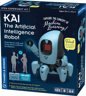 Kids can explore the future of advanced computing technology with KAI—short for Kosmos Artificial Intelligence—an app-enabled robot that uses machine learning. Using the app and a smart device's camera and microphone, your kid can record physical gestures and sounds, assigning them to KAI's five functions: walk forward and backward, turn left and right and stop. The AI will learn to recognize each gesture or sound, even if they differ in small details, and the more data collected, the better the AI will learn from it. Mechanically, KAI is a fascinating robot that can walk on six legs and rotate its upper body around 360 degrees, allowing it to turn toward any direction on the spot. Composed of 25 red LEDs, its face display can be programmed via the app to show different expressions and scrolling messages. A full-color, 64-page manual provides step-by-step illustrated assembly and programming instructions, teaches lessons in AI and robotics, and includes a fun, comic-book-style story that brings KAI to life.