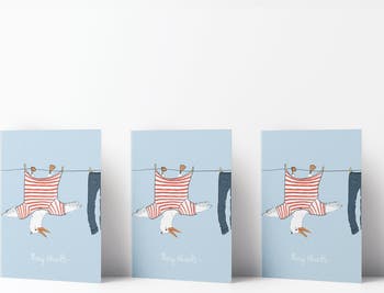 This 3-pack of Thank You greeting cards is elegantly illustrated by artist Ingrid Ramus, founder and owner of the Ramus & Co brand. Front artwork features "many thanks" bird hanging upside down. The cards are blank inside. All greeting cards are made in the USA on heavyweight uncoated and locally-manufactured card stock. Each card is individually wrapped in TUV Austria certified-compostable PLA sleeves. Each card is accompanied by a hand-embossed envelope made with heavyweight 95lb paper and a peel-and-stick flap - no licking envelopes here! All Ramus & Co. greeting cards are printed on FSC and SFI certified paper sourced from a regional mill that harnesses 66% of its energy from on-site sustainable sources, such as emission-free hydroelectricity and biomass co-generation from wood waste. Additionally, our greeting cards are thoughtfully packaged in bags made from certified compostable PLA material. Husband-and-wife team Calvin and Ingrid Ramus founded Ramus & Company in 2019, in New England, USA. Ingrid, the creative designer behind the brand, originates from Mexico, where she cultivated her skills in fashion and textile design. Drawing from her unique and inquisitive perspective on preppy style, Ingrid prolifically designs whimsical yet classic stationery and lifestyle items.