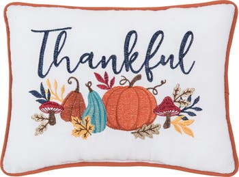 Jump into cooler weather and piles of leaves with this fall inspired pillow. Embroidered pumpkins of all shapes and colors, sitting amongst autumnal mushrooms and twigs, and a cursive Thankful, pop against the white ground. Finished with a contrasting piped edge this pillow is the perfect accessory for your Fall decor.