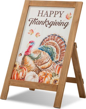 This charming easel sign, features the message "Happy Thanksgiving" in brown on a white wood background with colorful Turkey. Easel design differentiate it from other porch signs.This sign makes a distinctive home decorative piece, and you can use it to adorn your loft, foyer, porch etc.