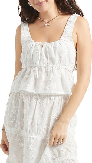 Cut from light and breezy cotton, this cropped tank is accented with floral stitching and finished with a flouncy hem.