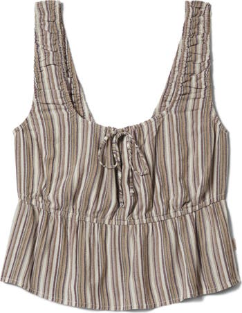 Elastic at the waist creates a fluttery peplum on this summery woven top designed with a tie at the neckline and retro stripes.