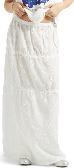 Floral appliqués add texture and charm to this flowy tiered maxi skirt cut from lightweight cotton and topped with a comfortable elastic waist.