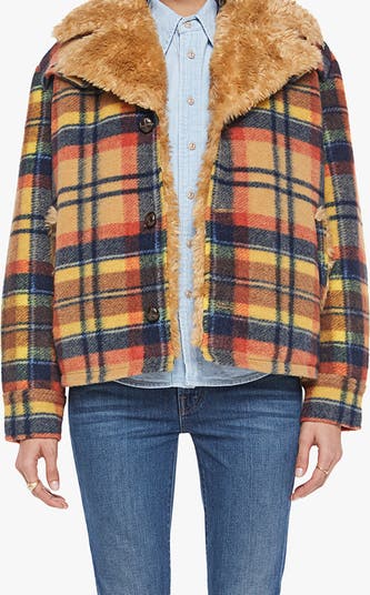 Luxuriously plush faux-fur lining and a broad, enveloping collar dial up the coziness of this rugged plaid jacket designed with a Western-inspired peaked yoke.