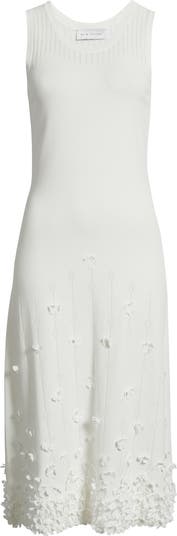 Fluttering flowers bloom at the skirt of this figure-skimming knit maxi accented with neckline pointelle stitching.