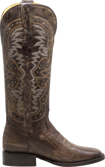 Experience refined elegance with these square-toe boots crafted from rich brown cracked leather. The shaft is adorned with intricate silver and gold embroidery, enhanced by delicate gold accents, creating a sophisticated and timeless design. Featuring a durable leather sole, these boots combine lasting comfort with exceptional quality. Proudly made in Mexico, they reflect a heritage of superior expertise and meticulous attention to detail. Perfectly balancing classic construction with modern aesthetics, this pair embodies a distinguished style ideal for both formal occasions and elevated everyday wear.