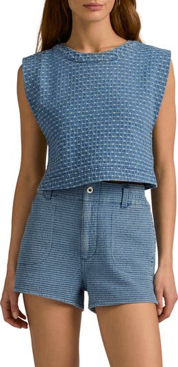 Cut in a boxy cropped fit, this patterned sleeveless top is made with strong shoulders and airy side buttons.