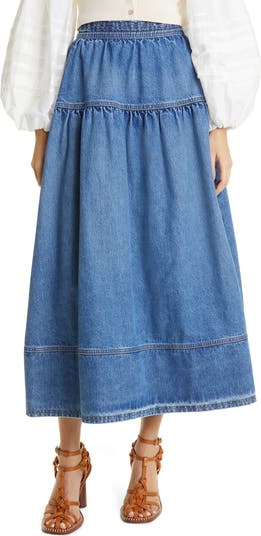 This Western-inspired jean skirt is cut in a lengthy silhouette with handy pockets and pronounced contrast topstitching.