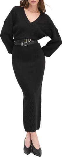 Stitched with a chevron pattern for gorgeous texture, this sassy sweater-dress is knit with blouson sleeves and a relaxed bodice that lead to a curve-hugging skirt.