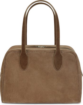 Clean lines and a structured profile distinguish a spacious satchel designed with multiple interior compartments and suspended from slim shoulder straps.