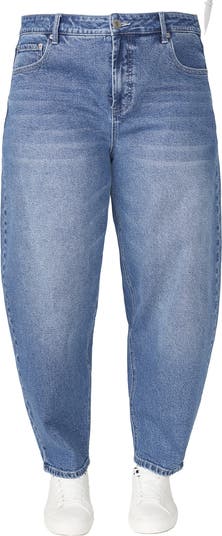 Barrel legs curve out at the knees and taper down to the hems to give these stretch-denim jeans a bold, fashion-forward silhouette.