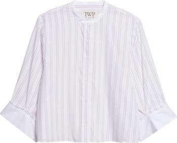This button-up shirt is cut from lightweight nonstretch cotton shirting for a crisp, structured feel. A band collar and button placket keep the look clean, while three-quarter sleeves with exaggerated contrast cuffs add a bold, modern finish.