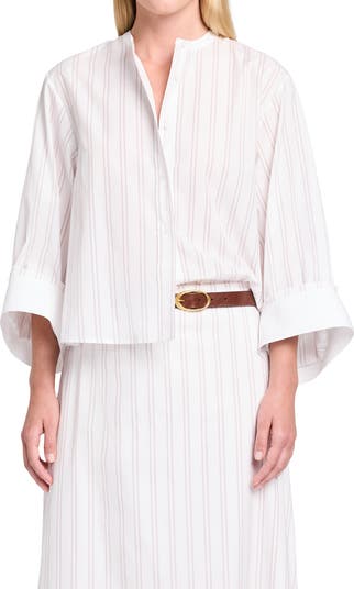 This button-up shirt is cut from lightweight nonstretch cotton shirting for a crisp, structured feel. A band collar and button placket keep the look clean, while three-quarter sleeves with exaggerated contrast cuffs add a bold, modern finish.