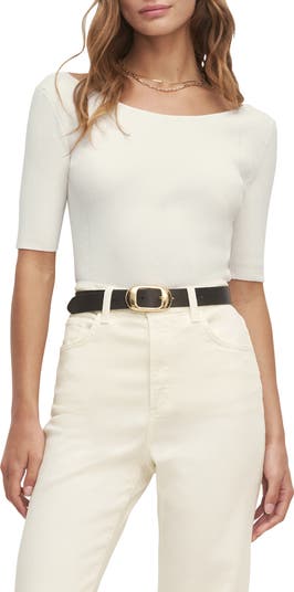Make every exit a little more dramatic with the low scooped back of this elbow-sleeve top that owes its figure-skimming fit to the stretchy ribbed knit.