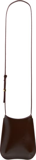 A polished bauble embellishes the adjustable shoulder strap of this structured pouch-style bag crafted in Italy from smooth, shiny calfskin in a curved shape sized to carry your phone and a few other essentials.
