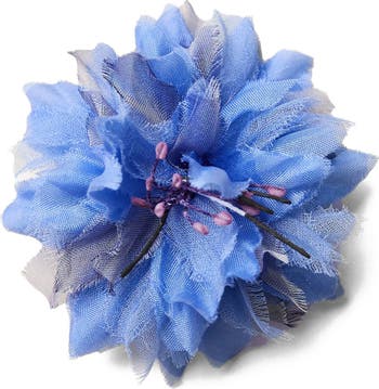 Commonly known as bachelor's button, the Blue Cornflower is an annual flowering plant native to Europe. With ties to royalty, this bright bloom symbolizes trust, loyalty and wisdom. The blue cornflower blooms naturally among cornfields, and is often associated with open spaces, freedom, intuition and imagination. Handcrafted with cornflower blue silk habotai, fuschia cross-dyed silk chiffon, blue silk charmeuse and silk shantung petals, this vibrant flower showcases a mix of black and rosy pink stamens. The blue cornflower is the national flower of Estonia and the birth flower of the month of December.