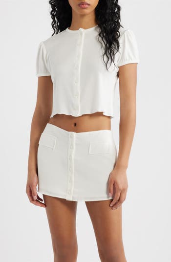 Sweeten everyday looks with this brushed jersey crop top framed by gently puffed sleeves and floral buttons.