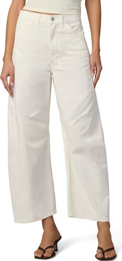 Low-stretch jeans get a fashion-forward update with a superhigh waist, a relaxed fit and curved legs that end at the ankles.