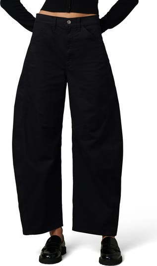 Stretch-twill pants get a fashion-forward update with a superhigh waist, a relaxed fit and curved legs that end at the ankles.