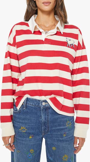Enjoy diving into the scrum or observing from the sidelines in a boxy cotton rugby shirt finished with a fuzzy bouclé lamb at the chest.